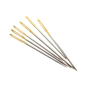 Las agujas están fabricadas en acero niquelado, lo que las hace resistentes y duraderas. Tienen el ojo dorado y largo para enhebrar hilos y materiales de diferentes grosores. Su punta roma redondeada no daña los tejidos.