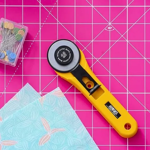 Cúter rotatorio de 45mm de la marca Olfa.   Una herramienta indispensable para trabajos de patchwork, costura y manualidades, ya que es capaz de realizar cortes rectos, en curva, hacia delante y hacia detrás, de tejidos, fieltro, goma eva, papel, etc.