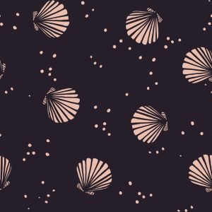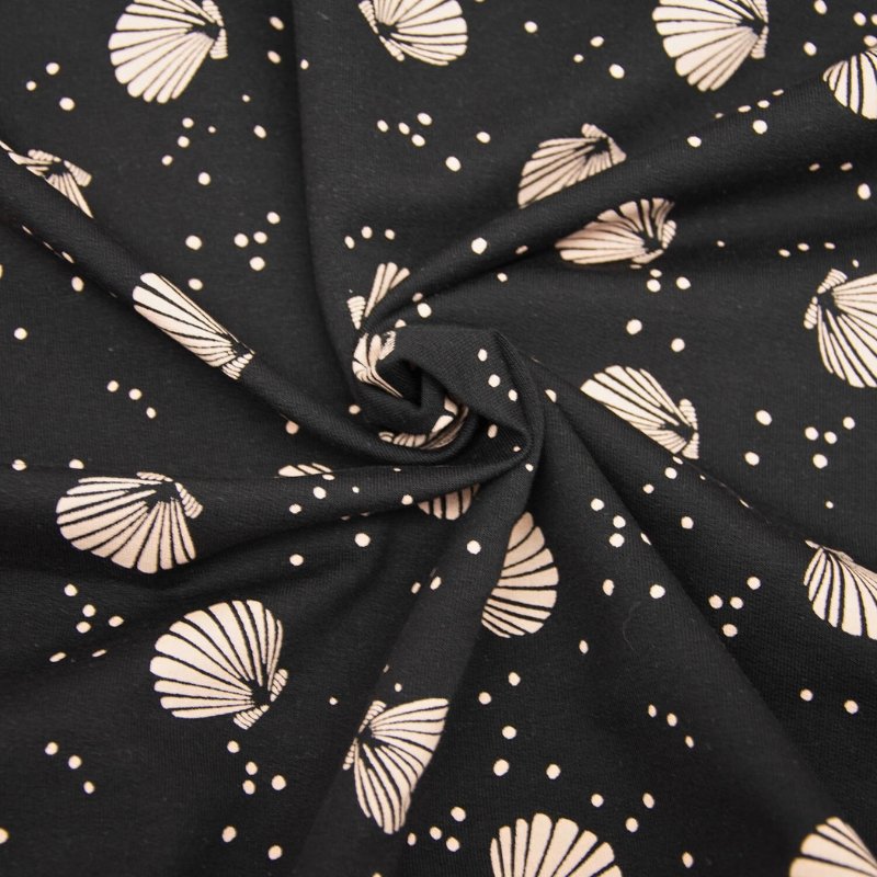 Tejido french terry o sudadera de verano con estampado de conchas de mar de color rosa claro sobre fondo negro.  Compuesta de algodón y un pequeño porcentaje de elastán con el que conseguirás prendas suaves y cómodas.