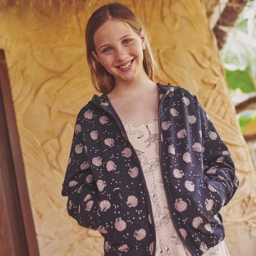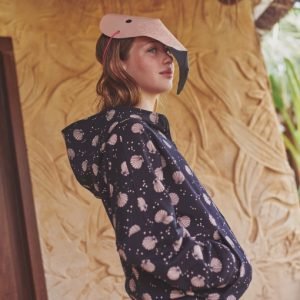Tejido french terry o sudadera de verano con estampado de conchas de mar de color rosa claro sobre fondo negro. Con un tacto muy agradable y suave, perfecto para prendas cómodas de entretiempo.  Puedes encontrar prendas confeccionadas con esta tela en la revista Travel Postalcards de Katia fabrics para la temporada primavera-verano 2024.
