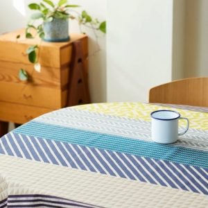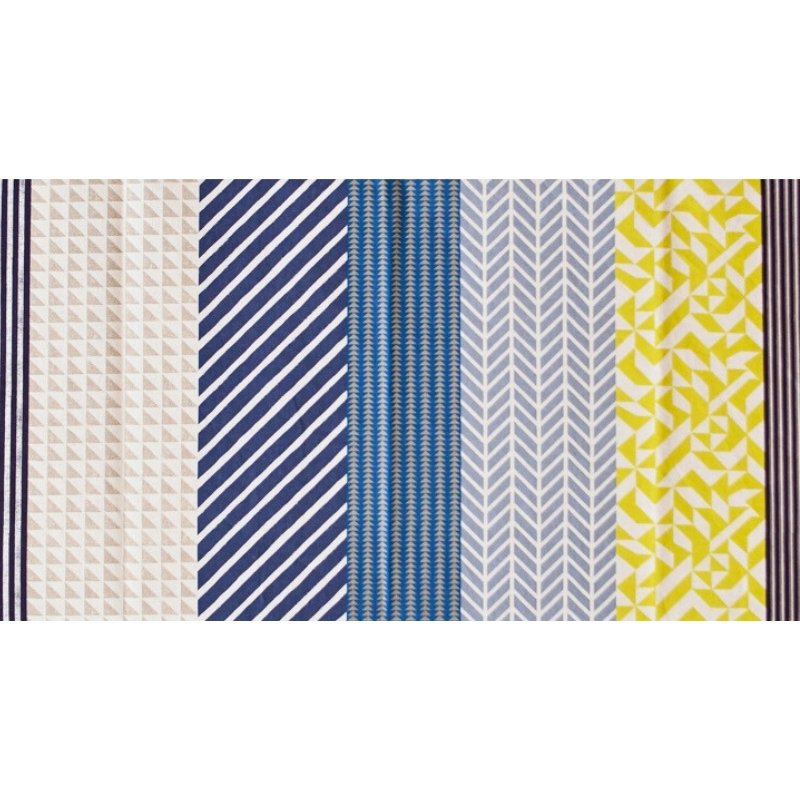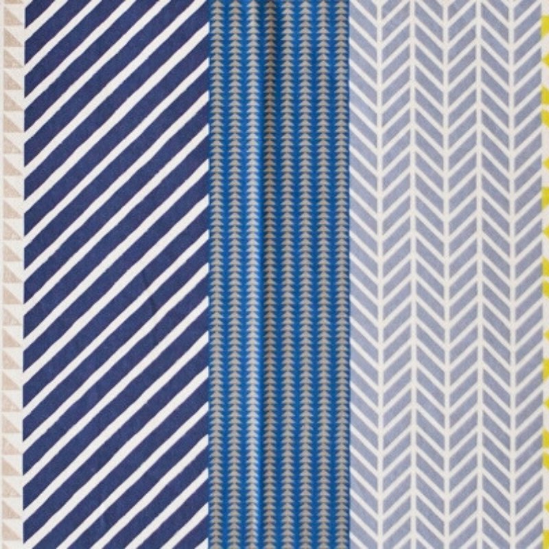 Canvas de lino y algodón con estampado inspirado en las huellas de ruedas de coche. Un diseño único en tonos grises, azules y amarillos, que ocupa todo el ancho de la tela en un tejido de alta calidad de la marca japonesa Kokka.