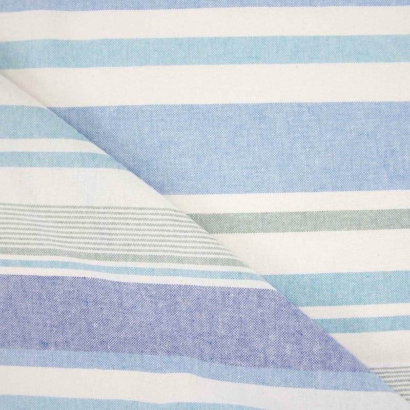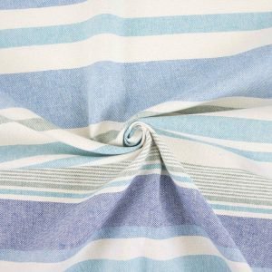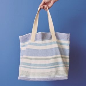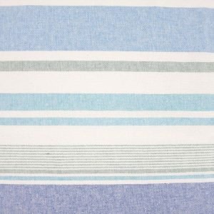 Loneta reciclada con líneas horizontales irregulares en tonos azul y verde sobre fondo crudo. Un diseño náutico que recuerda al mar y al verano.