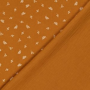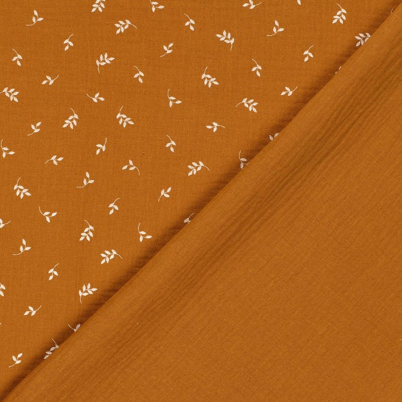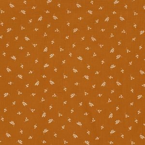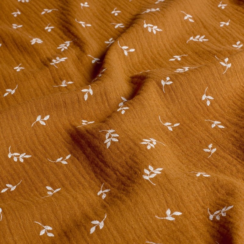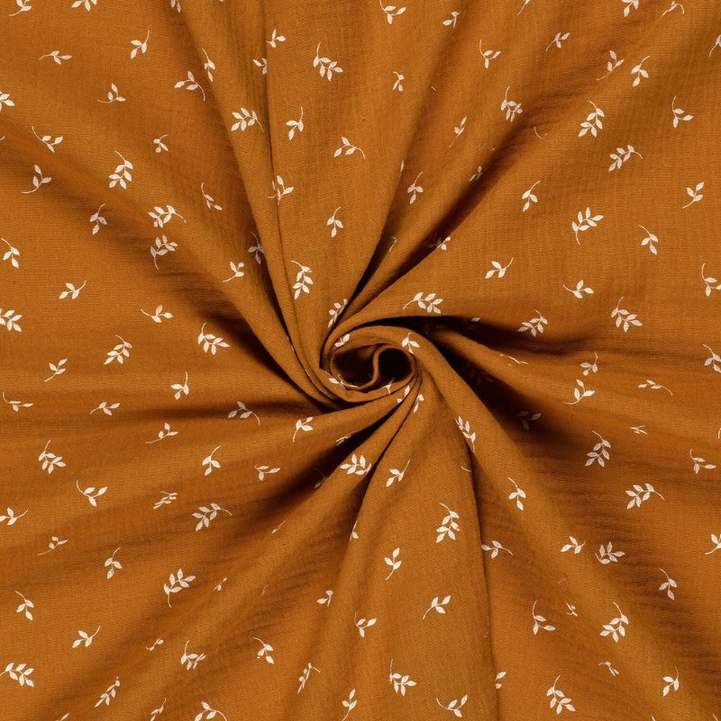 Muselina de suave algodón con delicado estampado de pequeñas hojas de color blanco sobre fondo caramelo.