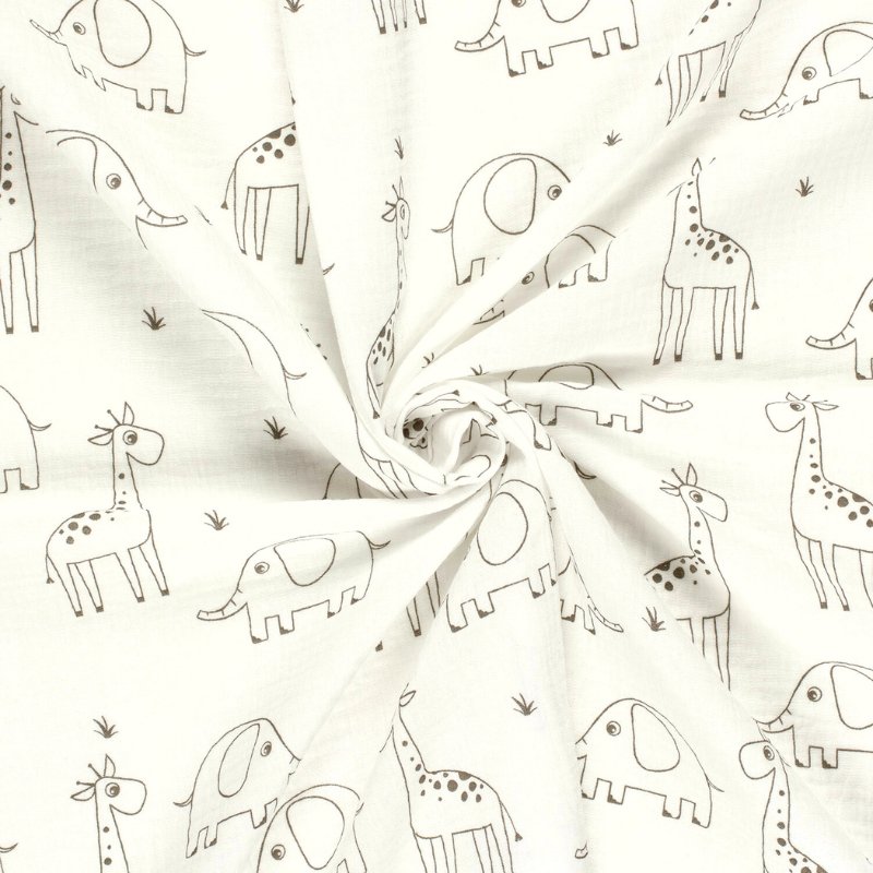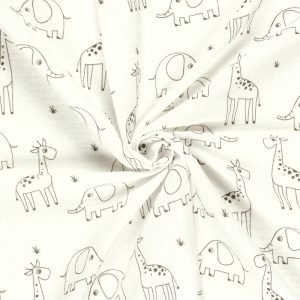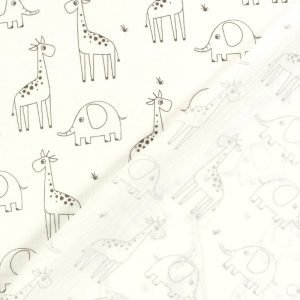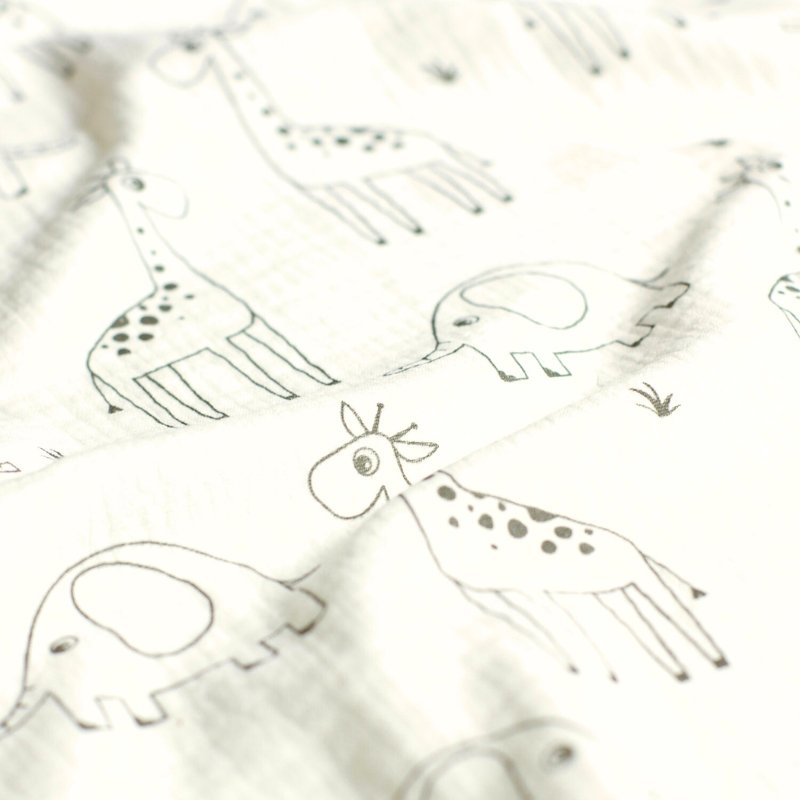 Sumérgete en un mundo de ternura y aventura con nuestra muselina de algodón. Presenta un encantador estampado de siluetas de jirafas y elefantes en un delicado tono gris sobre un suave fondo blanco roto. Su textura arrugada y ligera, característica de la doble gasa, la hace perfecta para confeccionar prendas cómodas y adorables para los más pequeños. Ideal para arrullos, ropa de cuna, vestidos y blusas con un toque safari.
