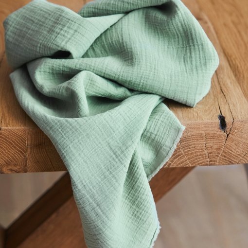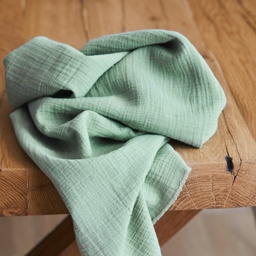 Descubre la elegancia natural y la suavidad incomparable de nuestra muselina de algodón orgánico en un delicado tono verde salvia. Con su textura arrugada y ligera, característica de la doble gasa, esta tela es ideal para confeccionar prendas frescas y delicadas, ropa de bebé, accesorios y textiles para el hogar. Su caída vaporosa y su tacto suave la hacen perfecta para proyectos que buscan confort y estilo. Diseñada en Dinamarca y fabricada en Turquía, esta muselina cuenta con los certificados GOTS y OEKO-TEX®, garantizando un tejido sostenible, seguro y de alta calidad.