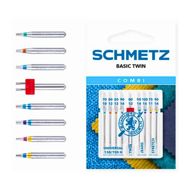 Pack combi basic twin de agujas surtidas para máquina de coser de la marca Schmetz. Con este práctico surtido tendrás en un sólo blíster las agujas tanto agujas universales para coser gran variedad de tejidos, como agujas para tejidos elásticos y para tejidos más gruesos y duros como vaqueros o lonetas. Este pack también incluye una aguja universal gemela. Todas las agujas son de cabo plano, por lo que son compatibles con la mayoría de máquinas de coser.
