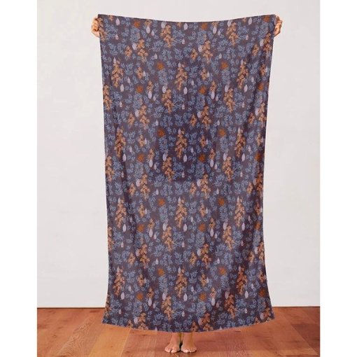 - Estampado floral otoñal: un diseño colorido y cálido en tonos azules, naranjas y marrones sobre fondo lila, con un sutil brillo satinado.