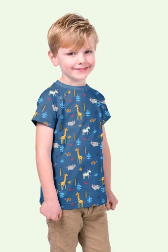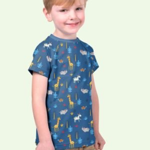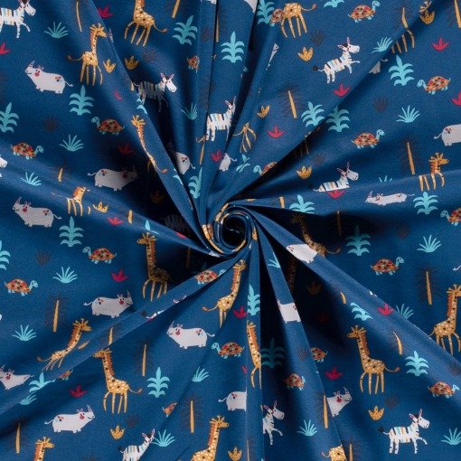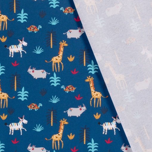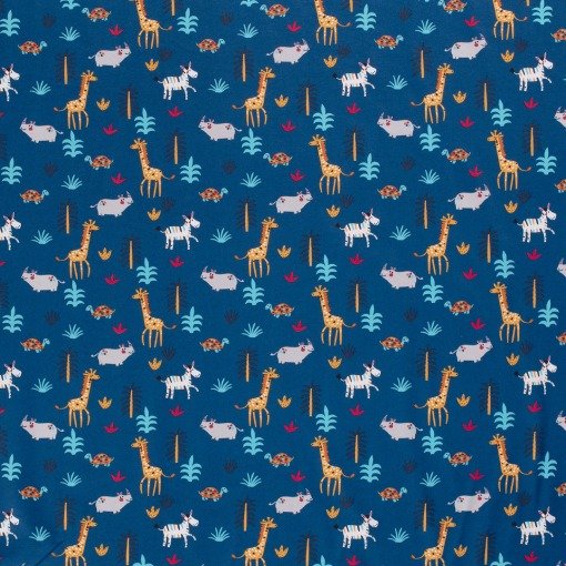 Tejido de punto de algodón con estampado infantil de jirafas, rinocerontes, cebras, tortugas y plantas sobre fondo azul índigo. Gracias a su suave algodón y a que lleva elastán, será la opción perfecta para prendas suaves y cómodas.