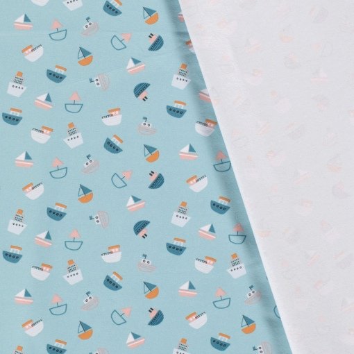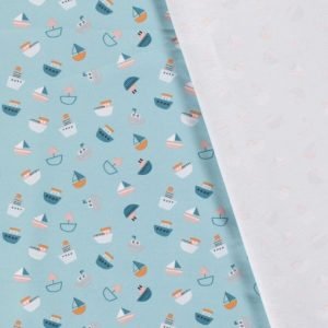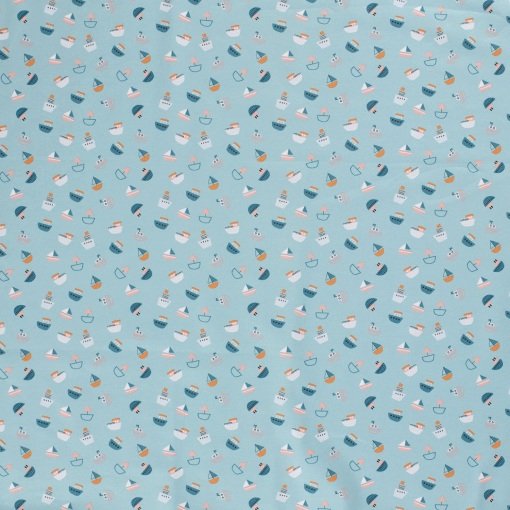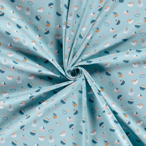Tejido de punto de algodón de barcos en tonos azules, blancos, naranjas, rosas y grises sobre fondo azul menta.