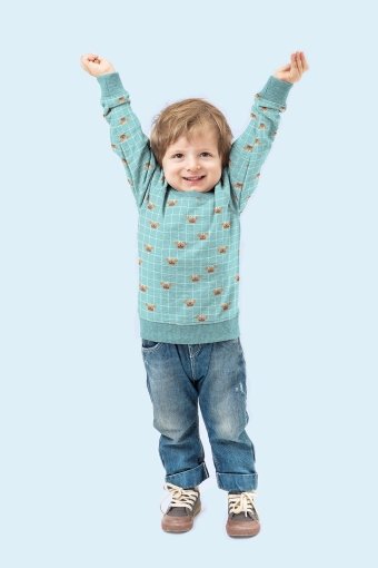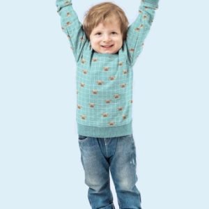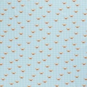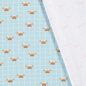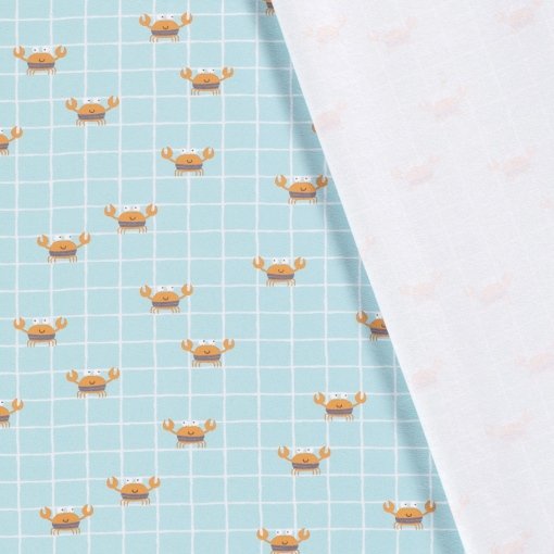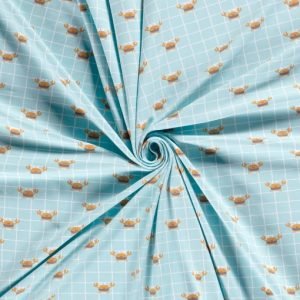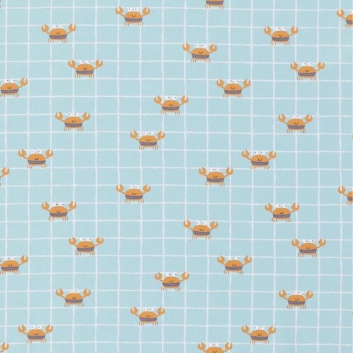 Tejido de punto con estampado infantil de alegres cangrejitos sobre fondo menta con cuadros blancos. Un estampado muy divertido en un punto de algodón muy suave para confeccionar prendas cómodas para los más peques de la casa.