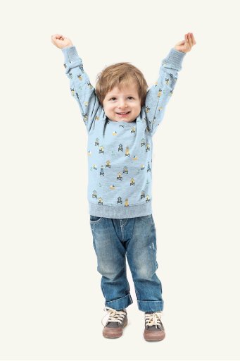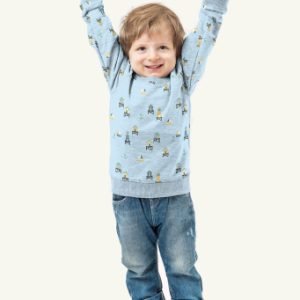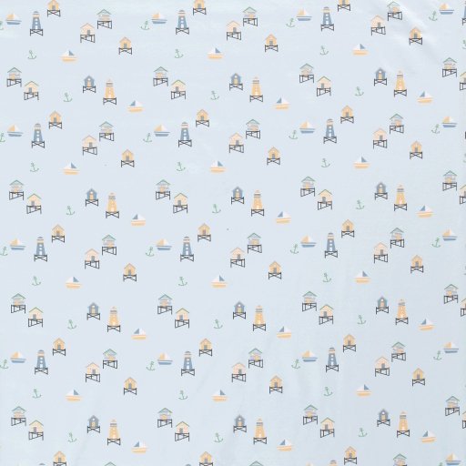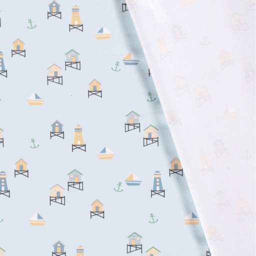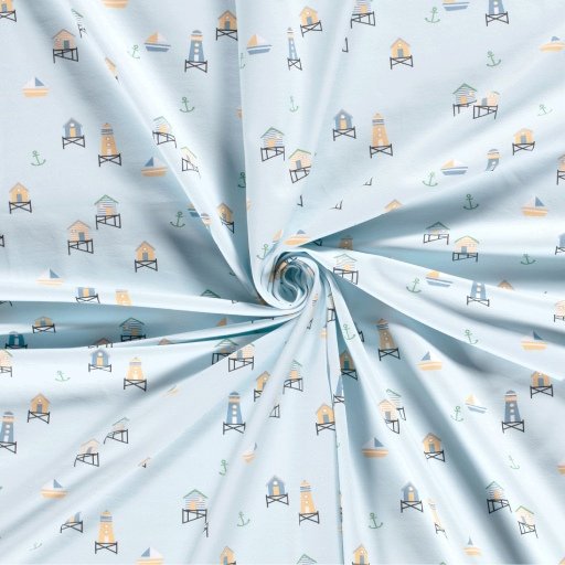 Tejido de punto de algodón con estampado de faros y casetas playeras en tonos suaves sobre fondo azul claro. Un tejido de lo más veraniego, ligero y transpirable para crear prendas cómodas y suaves.