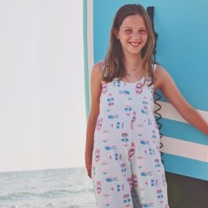 Tejido de punto de algodón con divertido estampado de tablas de surf en tonos azul aguamarina y rosa sobre fondo verde agua claro. Es de algodón con un pequeño porcentaje de elastán, por lo que es perfecta para prendas cómodas y ligeras.