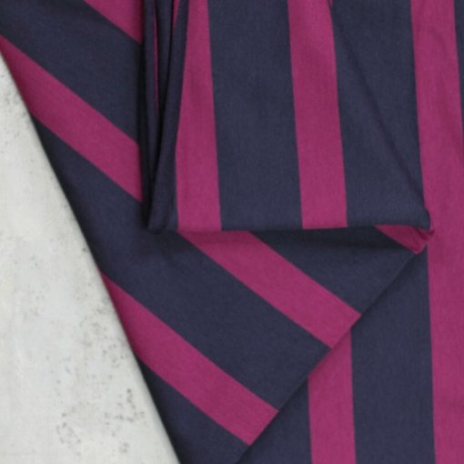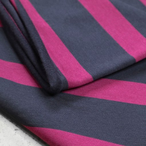 Tejido de punto de sudadera con rayas teñidas en color azul de 5,5 cm y en color fucsia de 3 cm.