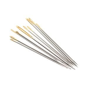 Las agujas están fabricadas en acero niquelado, lo que las hace resistentes y duraderas. Tienen el ojo dorado para enhebrar hilos y materiales de diferentes grosores con mayor facilidad
