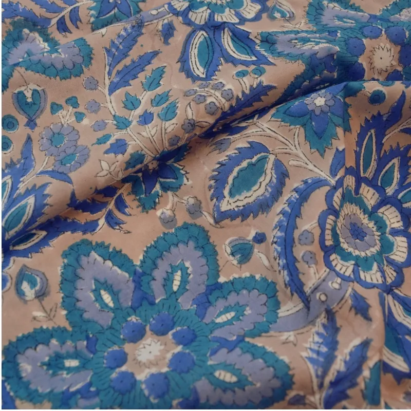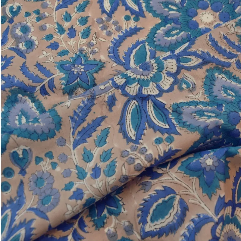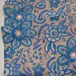 Tela de algodón india estampada a mano con la técnica artesanal Block Print.  Con un diseño único de flores en tonos azules y blanco sobre fondo marron claro.  Perfecto tanto para prendas frescas y ligeras como para  decoración.