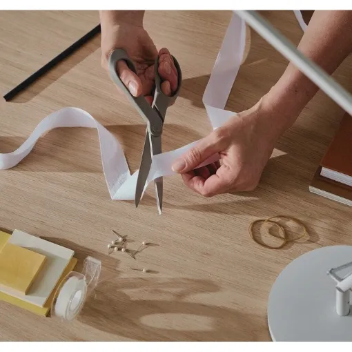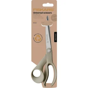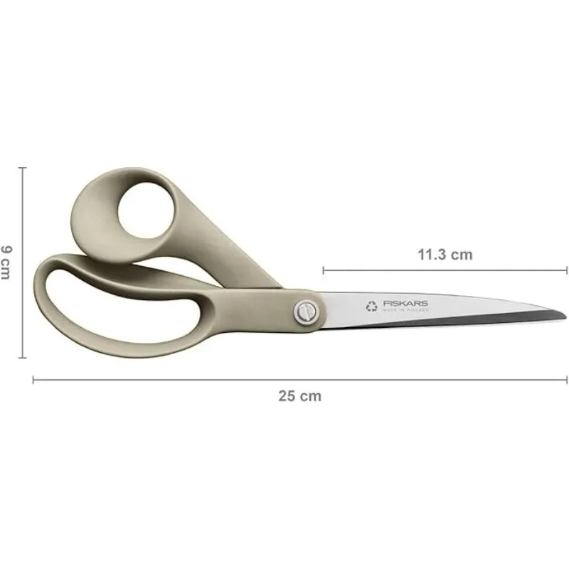 Grandes tijeras universales fabricadas con materiales reciclados (80%) y renovables (13%) para realizar cortes con comodidad. Son perfectas para una gran variedad de usos. Las grandes hojas de acero inoxidable recicado han sido rectificadas con precisión para mantener el filo más tiempo. Los grandes mangos de diseño ergonómico están fabricados con plástico reciclado (66% de residuos de embalajes postconsumo) y fibra de celulosa renovable (34%).