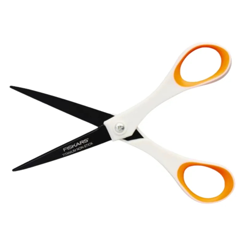 Tijeras universales de la marca finlandesa Fiskars. Son aptas para todo tipo de materiales ligeros y gruesos, además el tornillo puede ajustarse según el grosor de los materiales a cortar.