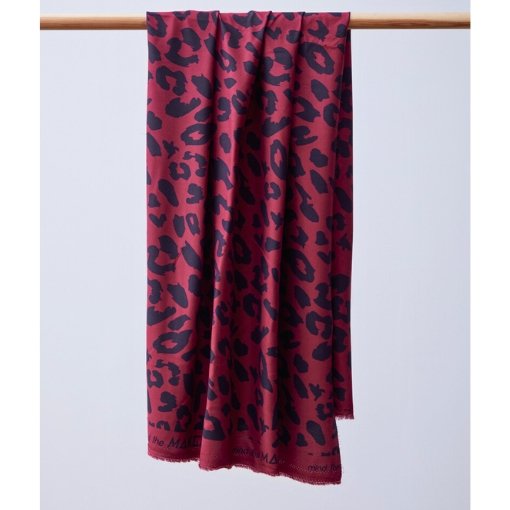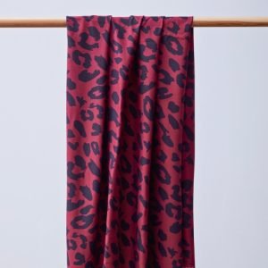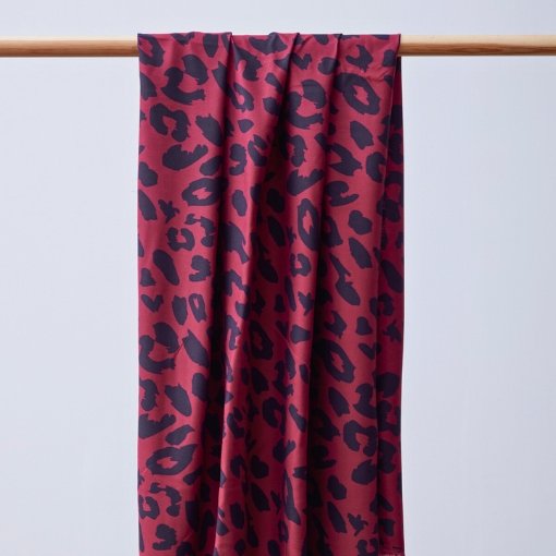 Twill de viscosa Ecovero™ con estampado de leopardo de color azul muy oscuro sobre fondo burdeos, un estampado que triunfa temporada tras temporada.