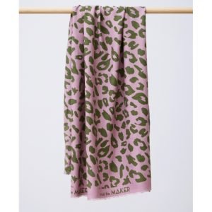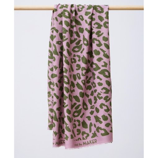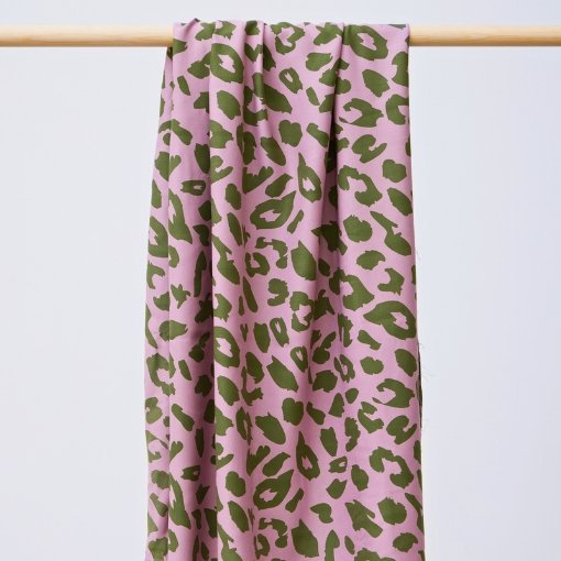 Twill de viscosa Ecovero™ con estampado de leopardo de color verde kaki sobre fondo lila claro, un estampado que triunfa temporada tras temporada.