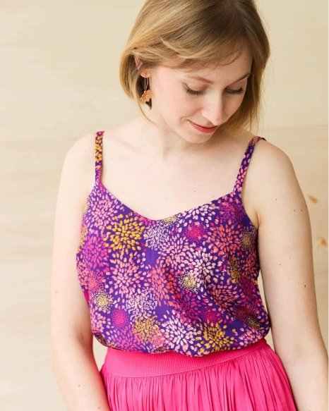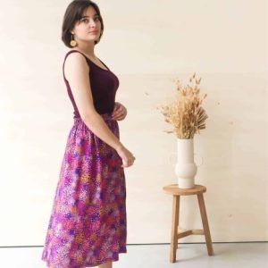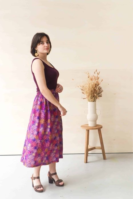 Color: Estampado en tonos rosas, coral y amarillo mostaza sobre un fondo violeta.