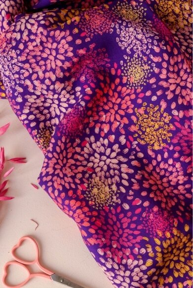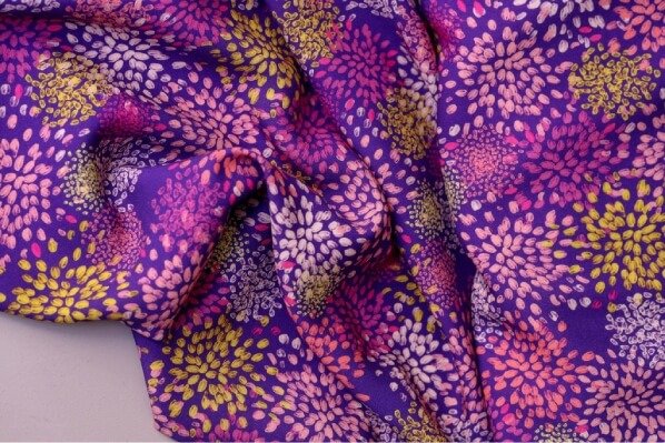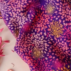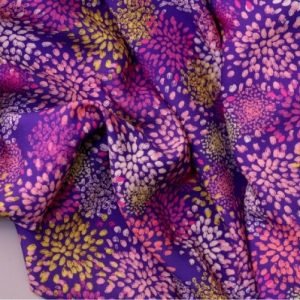 Tela de viscosa con estampado que simula fuegos artificiales sobre un fondo violeta que refleja el color del cielo al atardecer. Es una tela plana, vaporosa, con mucha caída lo que dará como resultado prendas frescas con mucho movimiento.