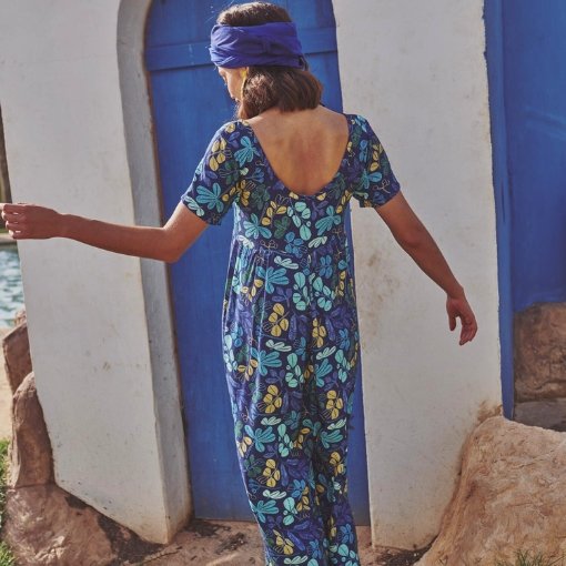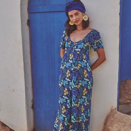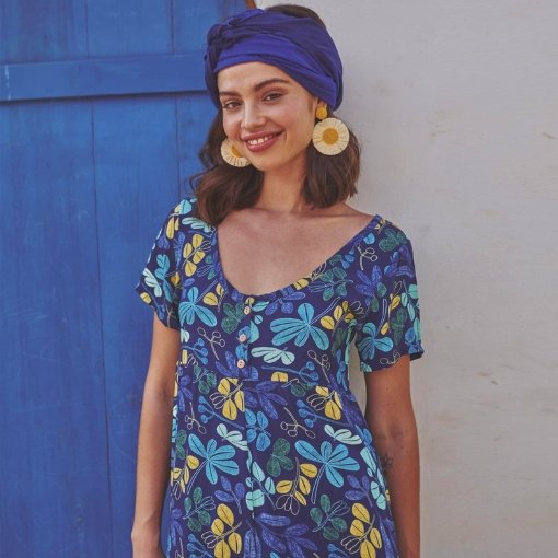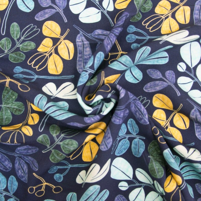 Tela de viscosa confeccionada a partir de fibras Lenzing™ Ecovero™ con estampado de flores y plantas en tonos azules, verdes y amarillos sobre fondo azul marino. Liviana, con mucha caída y movimiento, es perfecta para vestidos, faldas o blusas.
