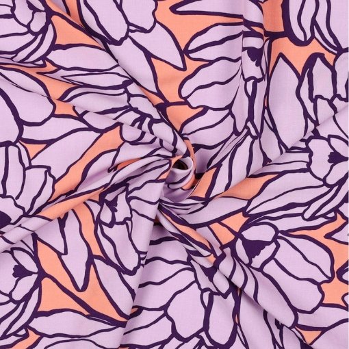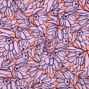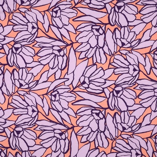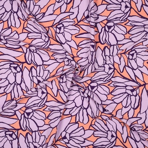 Tela de viscosa confeccionada a partir de fibras Lenzing™ Ecovero™ con flores lavanda sobre fondo naranja melocotón, de tacto muy suave con mucha caída ideal para prendas con movimiento.