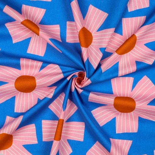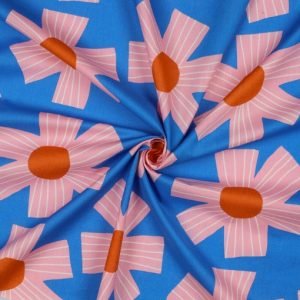 Luce creaciones llenas de vida con nuestra tela voile de algodón, adornada con un vibrante estampado de flores rosas sobre un fondo azul. Este diseño exclusivo, de la reconocida diseñadora australiana Nerida Hansen, aporta luz y color a tus proyectos de costura.